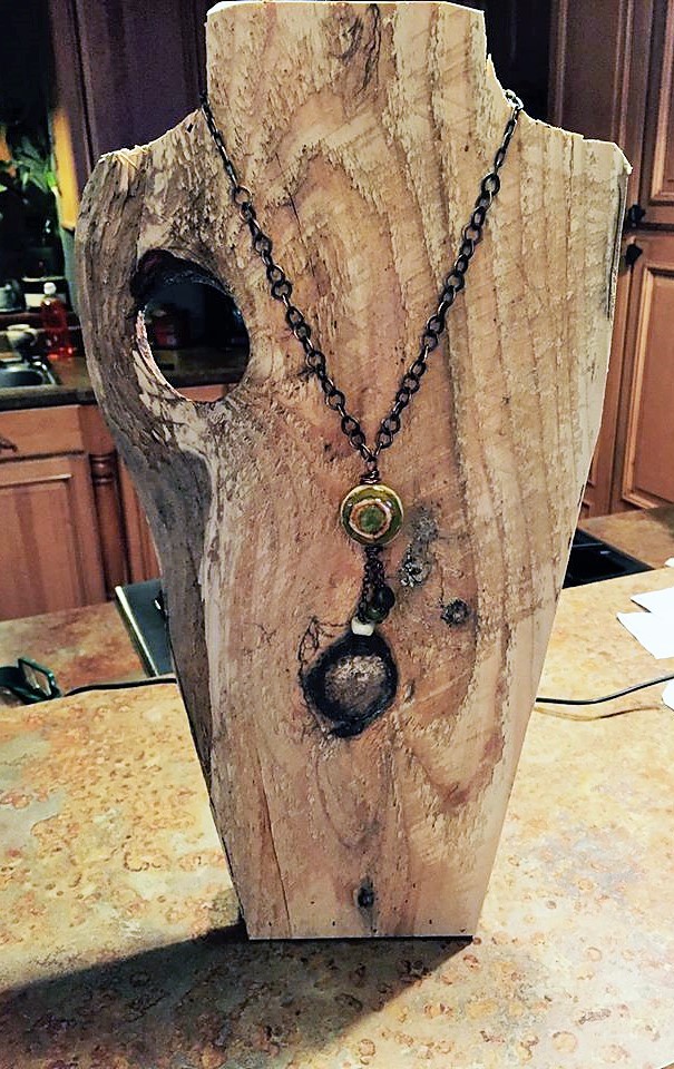 My request to him: Will you please make me a couple of tall necklace displays? I would like them made with wood with the least amount of grain that you can find so the jewelry pops out! I don't want anything that is too busy. He's retired so he told me he would make it while I was at work. I got home and this lovely display was sitting on the counter. I was a little taken aback!!